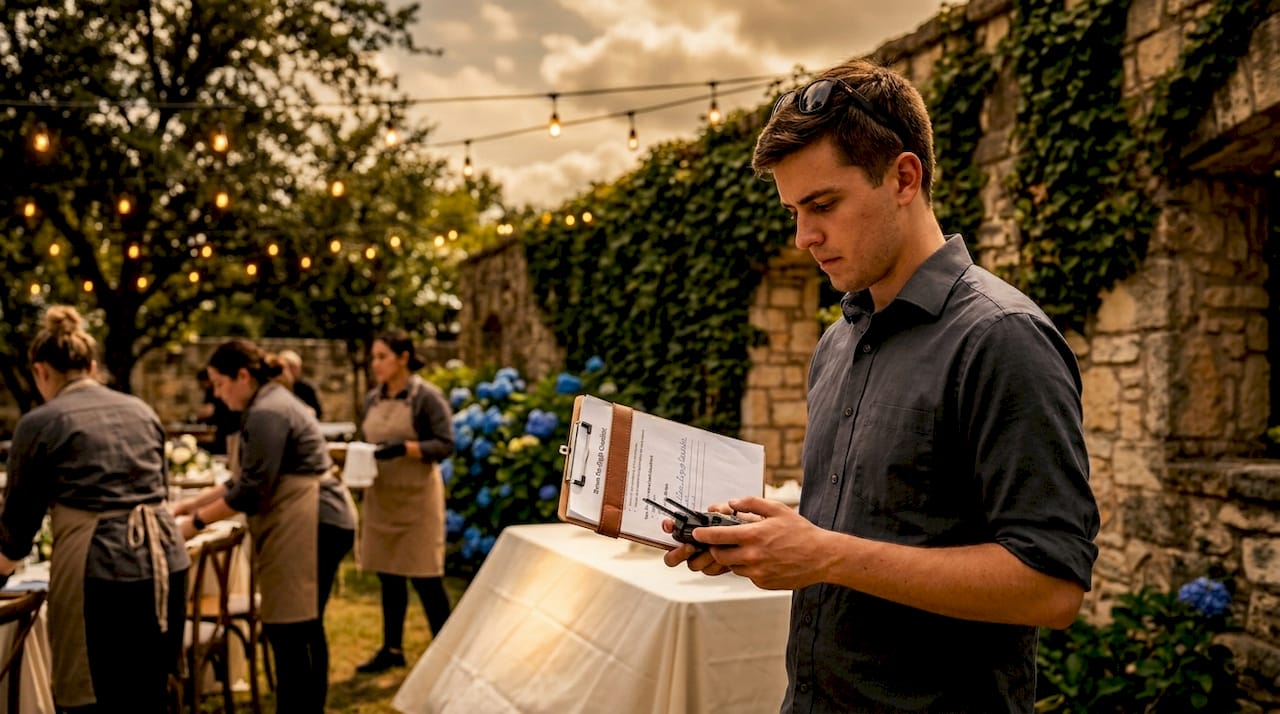 A pre-event site walkthrough is non-negotiable for complex venues. During the walkthrough, your pilot should identify takeoff and landing zones that keep the drone at least 100 feet from guests and 50 feet from structures. They should also note any obstacles, test the airspace authorization, and build a shot list with you based on what's actually achievable at that location.